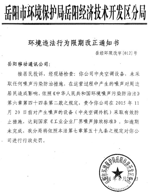 | 再次回复: | 开发区环保分局接到该信访件后,迅速组织执法人员赶赴现场进行了调查处理。 经查,英伦世家对面移动公司中央空调未采取任何噪声防治措施在运营过程中产生的噪声影响周边居民。为此,开发区分局环境监察大队下达文书要求该店采取隔音降噪措施,并于8月19日给该公司送达了环境违法行为限期改正通知书,责令该公司对产生噪声的设备采取有效防治措,达到国家《工业企业厂界噪声排放标准》的要求。该公司正在进行整改中,我分局将加强监督确保整改完成。 |