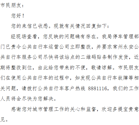 现在开发了公共单车扫码功能,用车十分方便,但青年东路中国银行边上的单车桩上的二维码全部被人刮掉了,无法通过扫码租车,望有关部门及时恢复,谢谢!