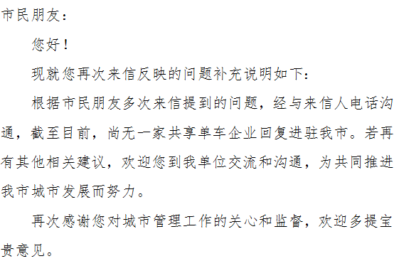 三、关于引进自行车企业的问题。根据我市市区车容量情况,结合城市发展规模和规划以及其它城市的管理经验,我局停车管理部门严格把关进驻共享单车的企业,优先考虑引进信誉好、服务良、形象佳的企业,并要求进驻企业加强现场停放的服务与管理。另外,为更好地保障市民切身利益,防止企业自身原因导致银行冻结账户,致使市民无法退款等相关问题,目前正与申请企业衔接企业押金账户等问题,确保为市民绿色出行提供良好骑行环境。