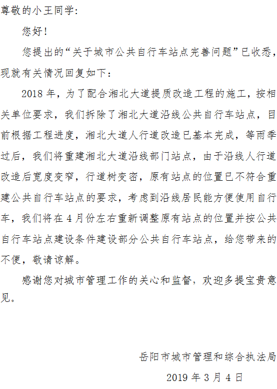 | 内容: | 希望在湖南理工学院南院大门再新设置一个城市公共自行车站点。湖南理工学院附近现在只有“湖南理工学院行政楼”一个站点,但是因为学校人口密集,又靠近奇家岭街道,使用人员多,导致该站点经常无车可用,或者还车人太多而无法就近停车。(湖南理工学院南院大门原来有一个公共自行车站点,但因学院路提质改造而拆除了,现湘北大道已经完工,希望能恢复原有站点) |